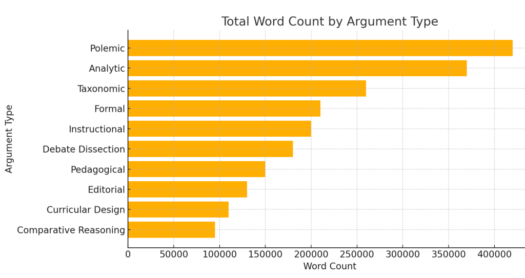 - Total Word Count by Argument Type – highlighting your strongest modes of engagement, especially Polemic, Analytic, and Taxonomic.