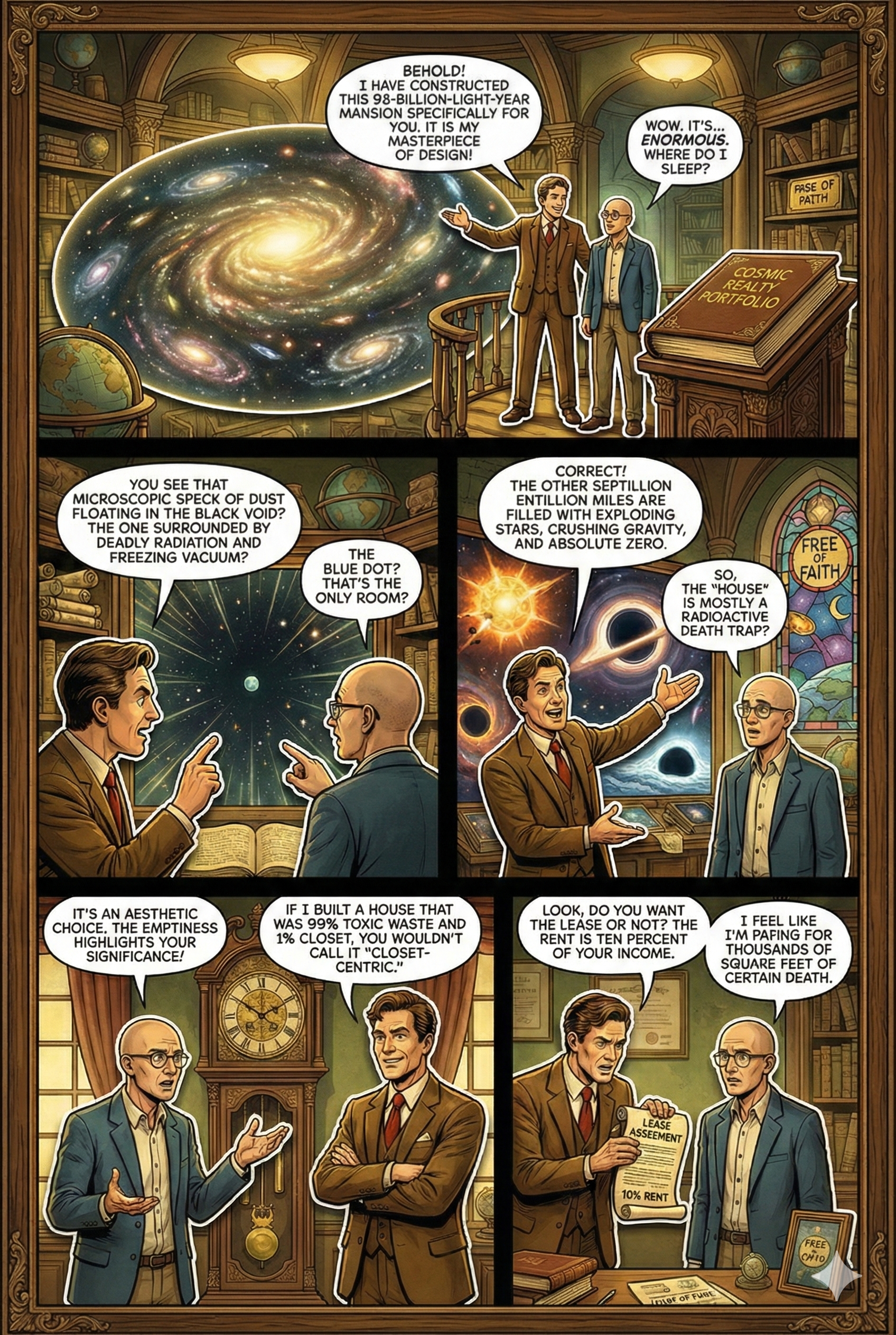 - Unfalsifiable Intent: If any cosmic state—whether mostly empty or teeming with life—can be reconciled with divine intention, then the claim that God designed the universe this way does not actually explain why it is inhospitable; it simply relabels observed facts as “willed by God.”