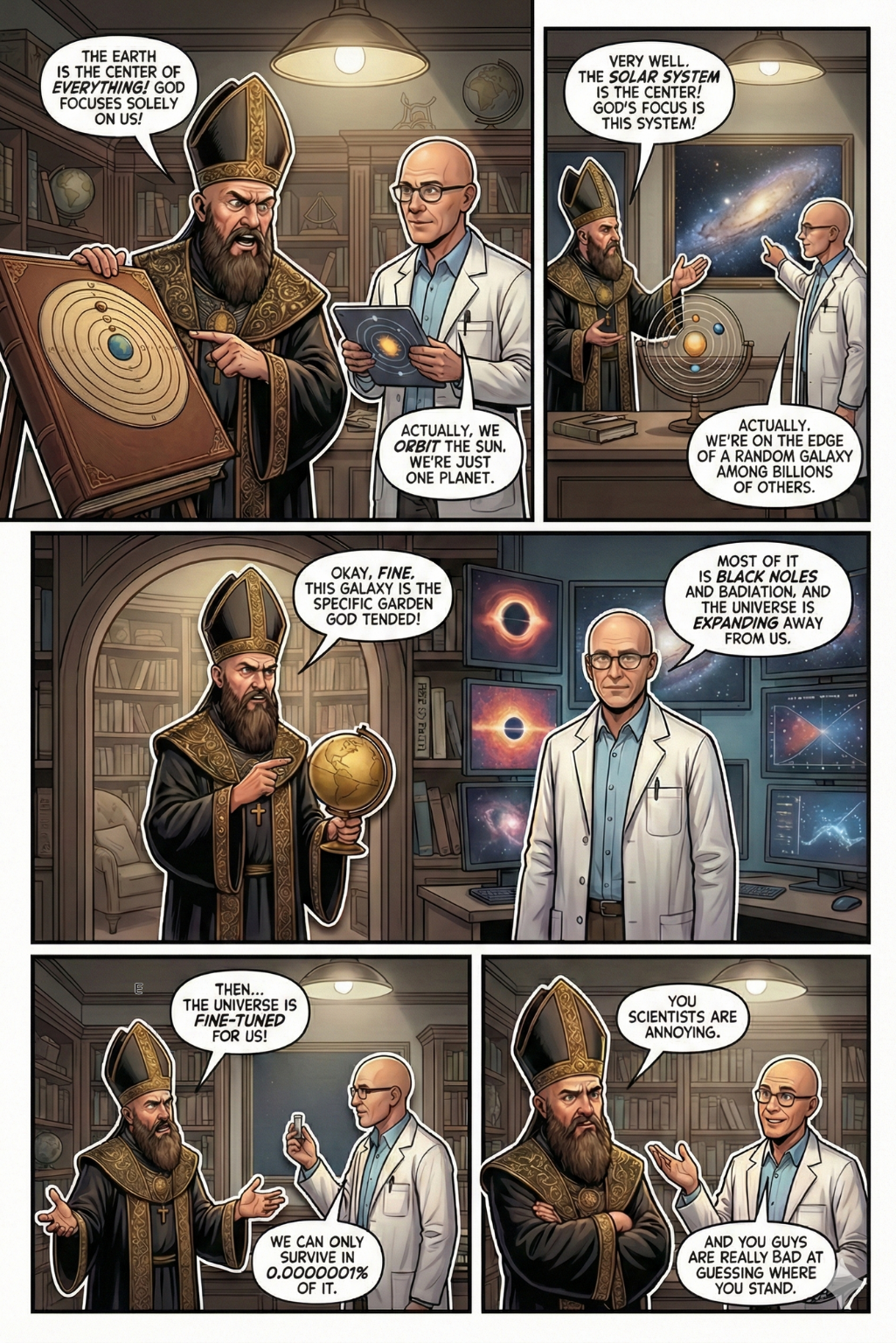 - Historical Presumption: The repeated assertion of cosmic human-centrism—even after major scientific revolutions—exhibits a recurring pattern of theological overreach. Religious frameworks often assume a privileged vantage point on God’s objectives, but the track record suggests otherwise.