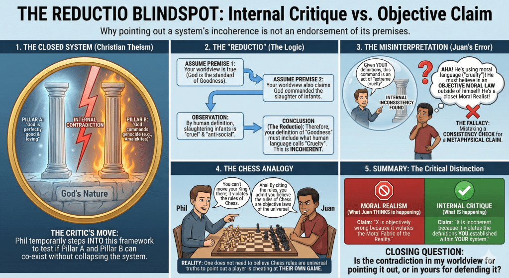 - The Fallacy: Juan insists that using any evaluative language must mean Phil secretly believes in objective moral facts. He refuses to accept the third option: that Phil is provisionally adopting Christian definitions to show they are incoherent.