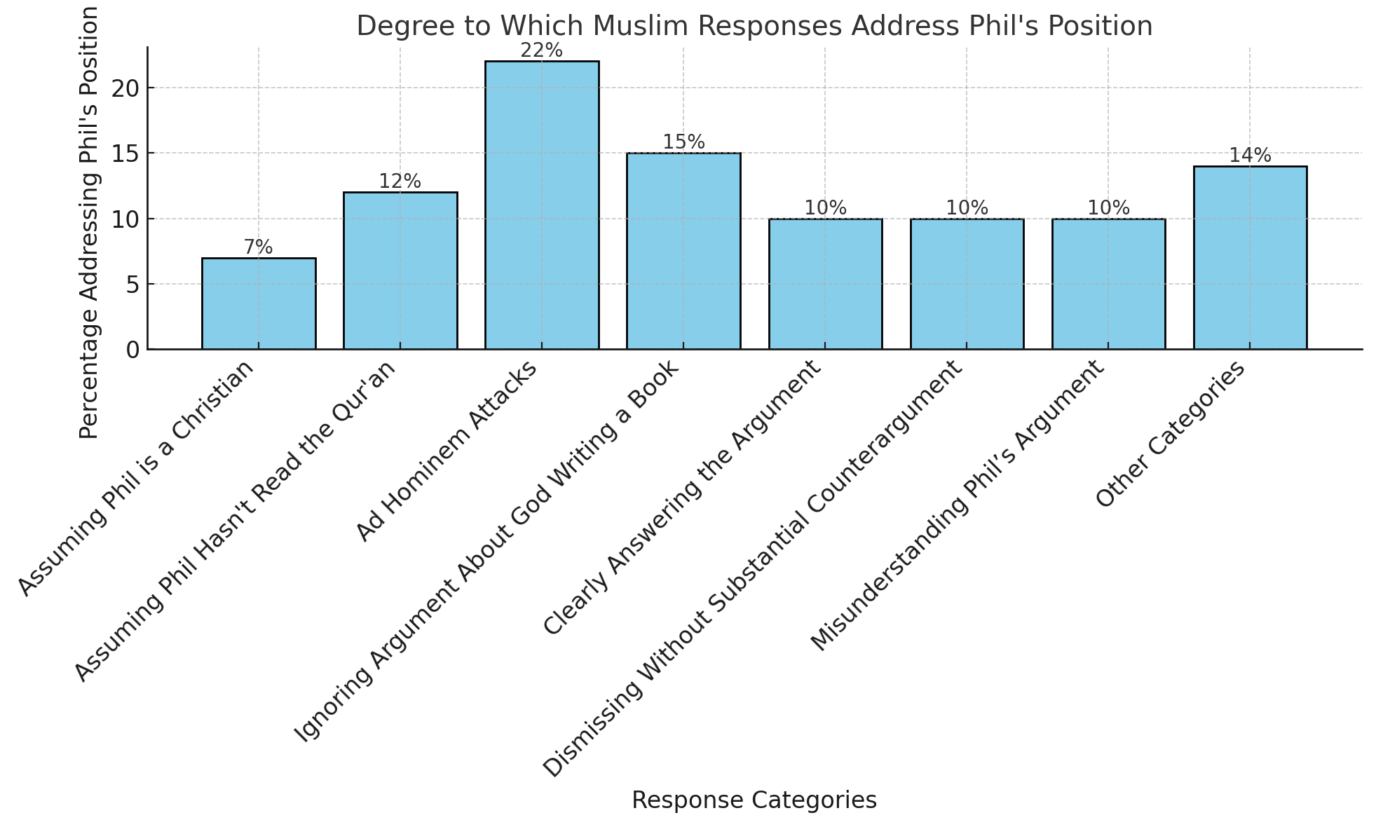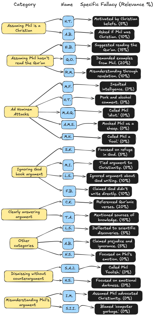 There were around 25 Muslims responding to Phil’s argument. The following provides their initials, followed by a description of their basic argument followed by an AI-generated assessment of their argument’s degree of relevance to Phil’s argument.