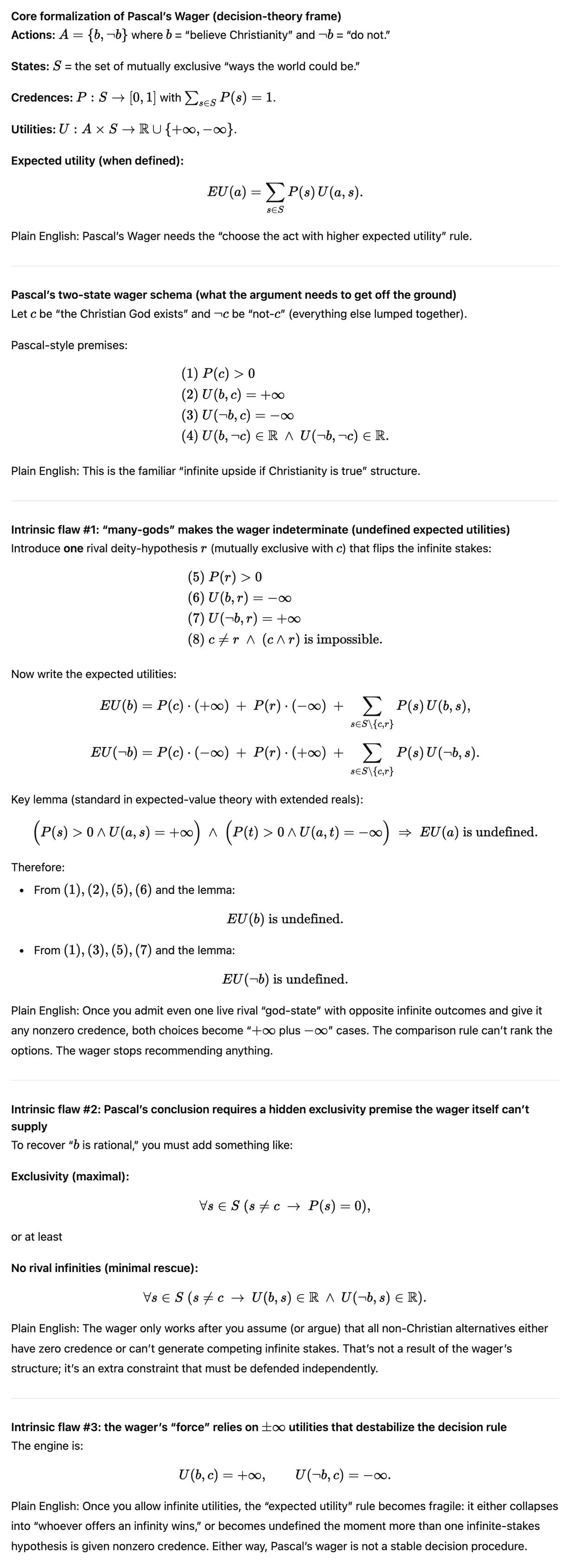 Plain English: once you permit infinite utilities, expected-utility comparison either collapses into “whoever promises an infinity wins,” or becomes undefined as soon as multiple infinite-stakes hypotheses have nonzero credence. Either way, the wager is not a stable decision procedure.