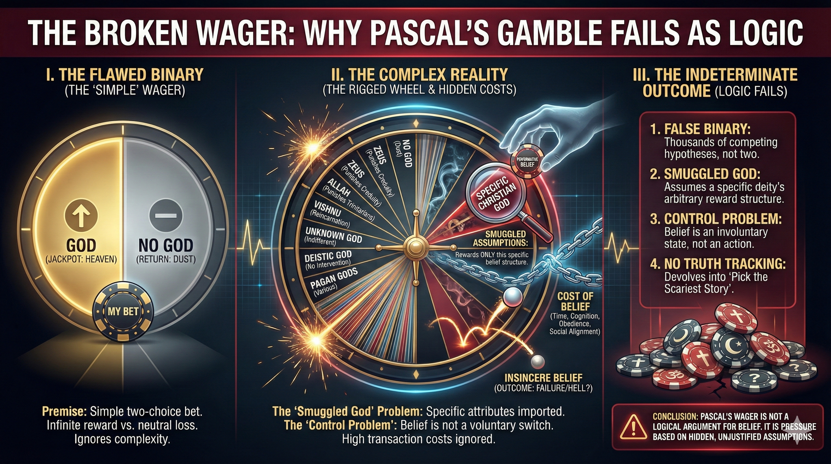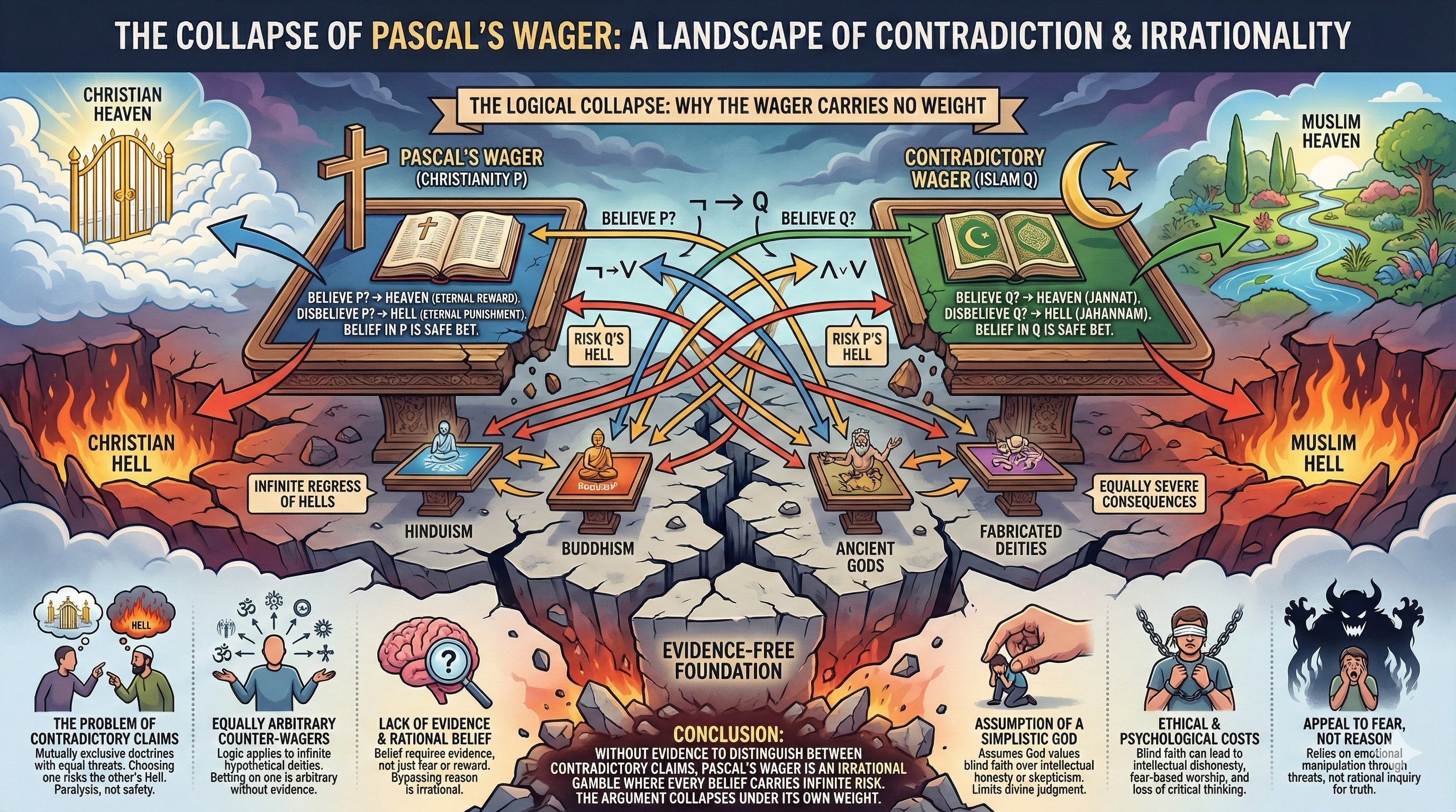 - The “wager” collapses because every belief carries infinite risk due to the existence of contradictory Hell claims.