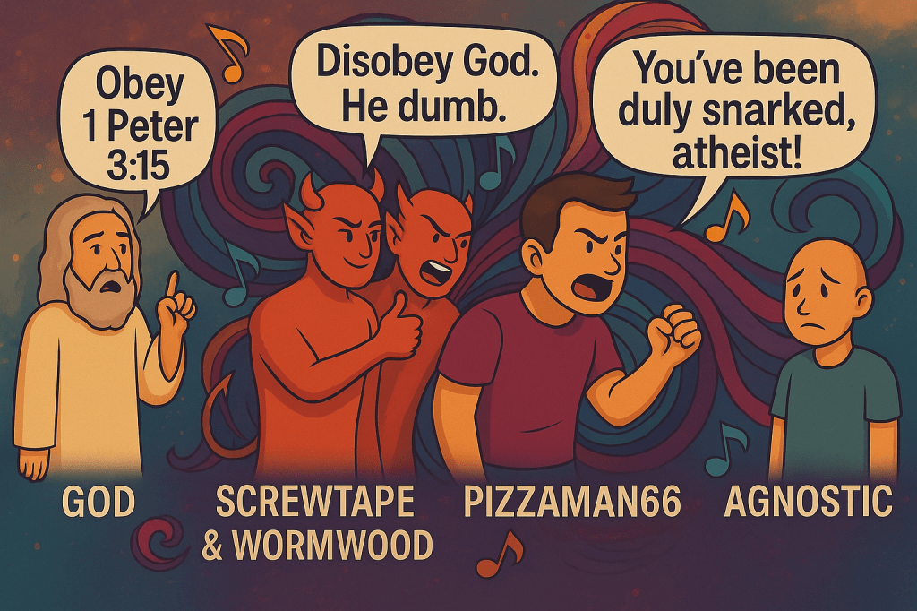 In conclusion, the Screwtape tactic is a powerful tool to address unruly apologists like Pizzaman66, whose disposition—marked by sarcasm, hostility, and pride—dishonors Christ. By exposing hypocrisy, engaging emotionally, encouraging reflection, and amplifying impact, it convicts where directness fails. Let Screwtape’s voice illuminate their sin, urging them to repent and align with 1 Peter 3:15’s gentle defense of the Gospel. For in satire’s mirror, truth shines brightest, calling wayward defenders back to their Lord.