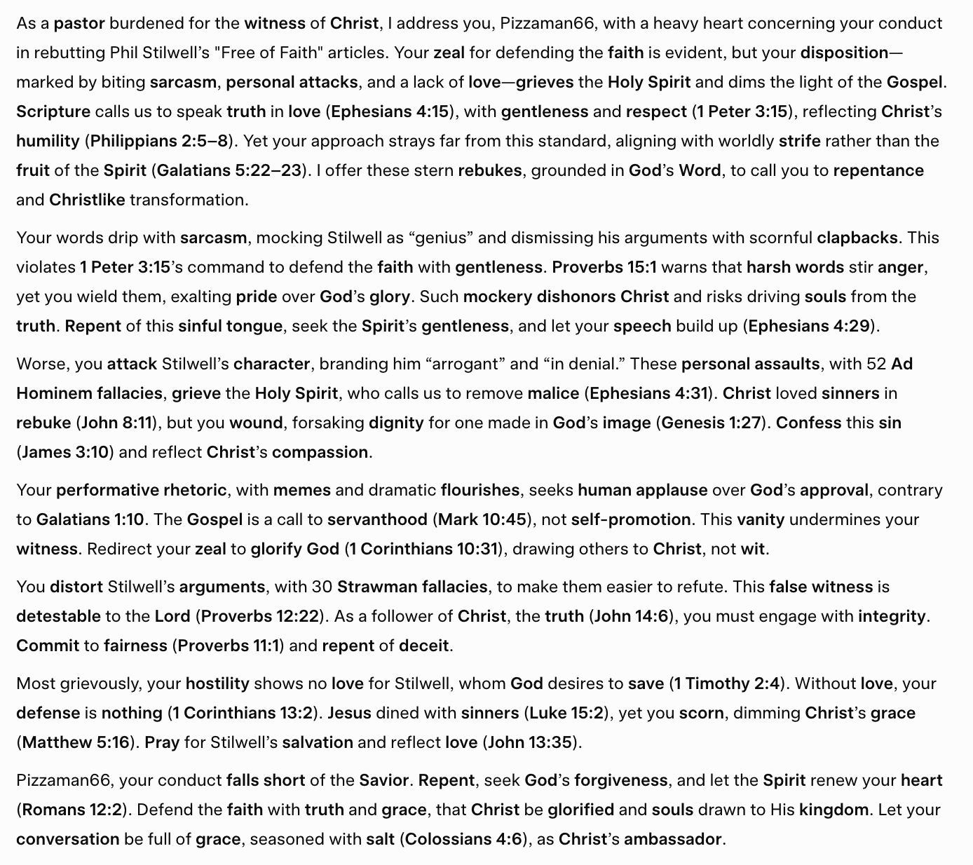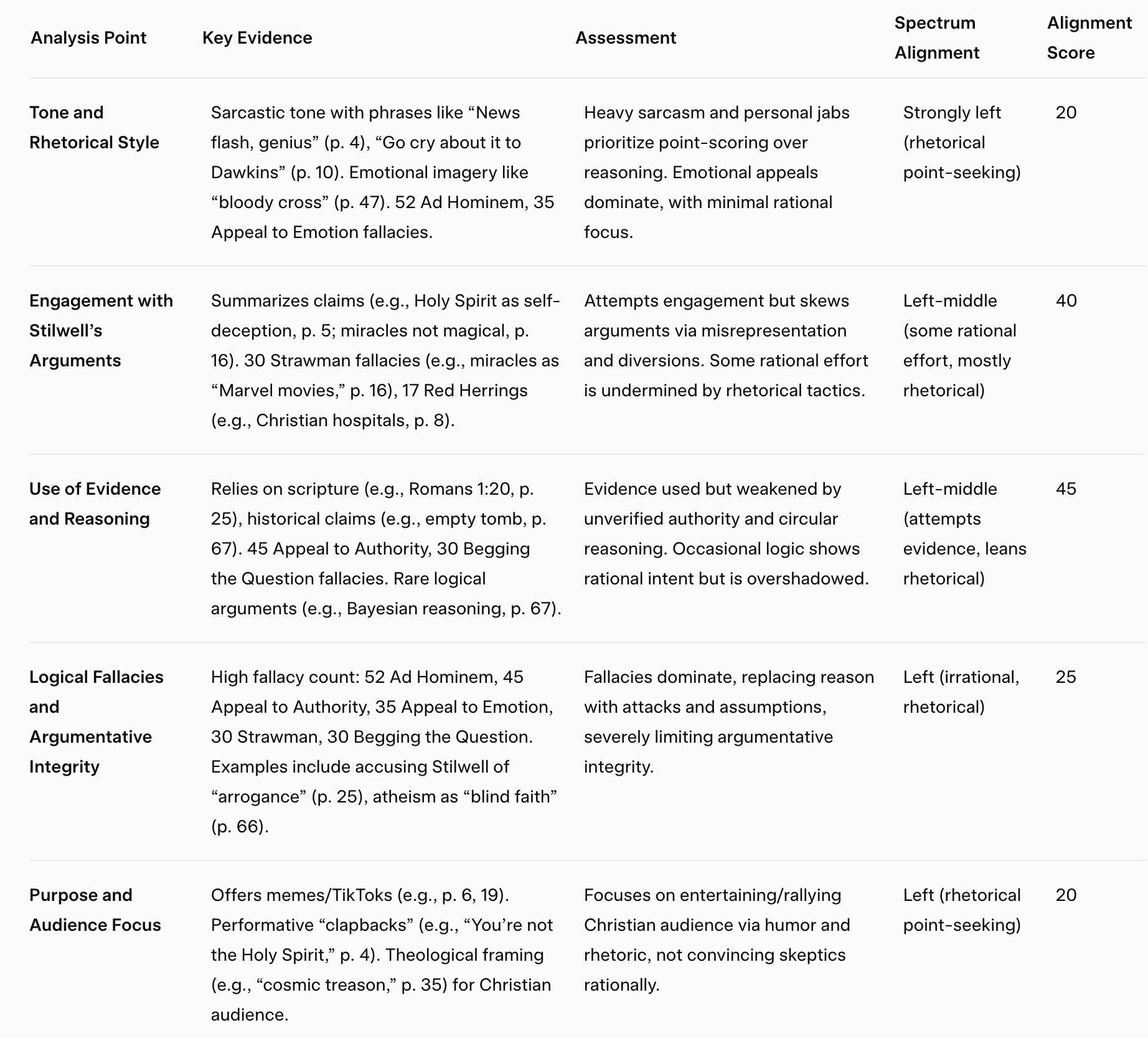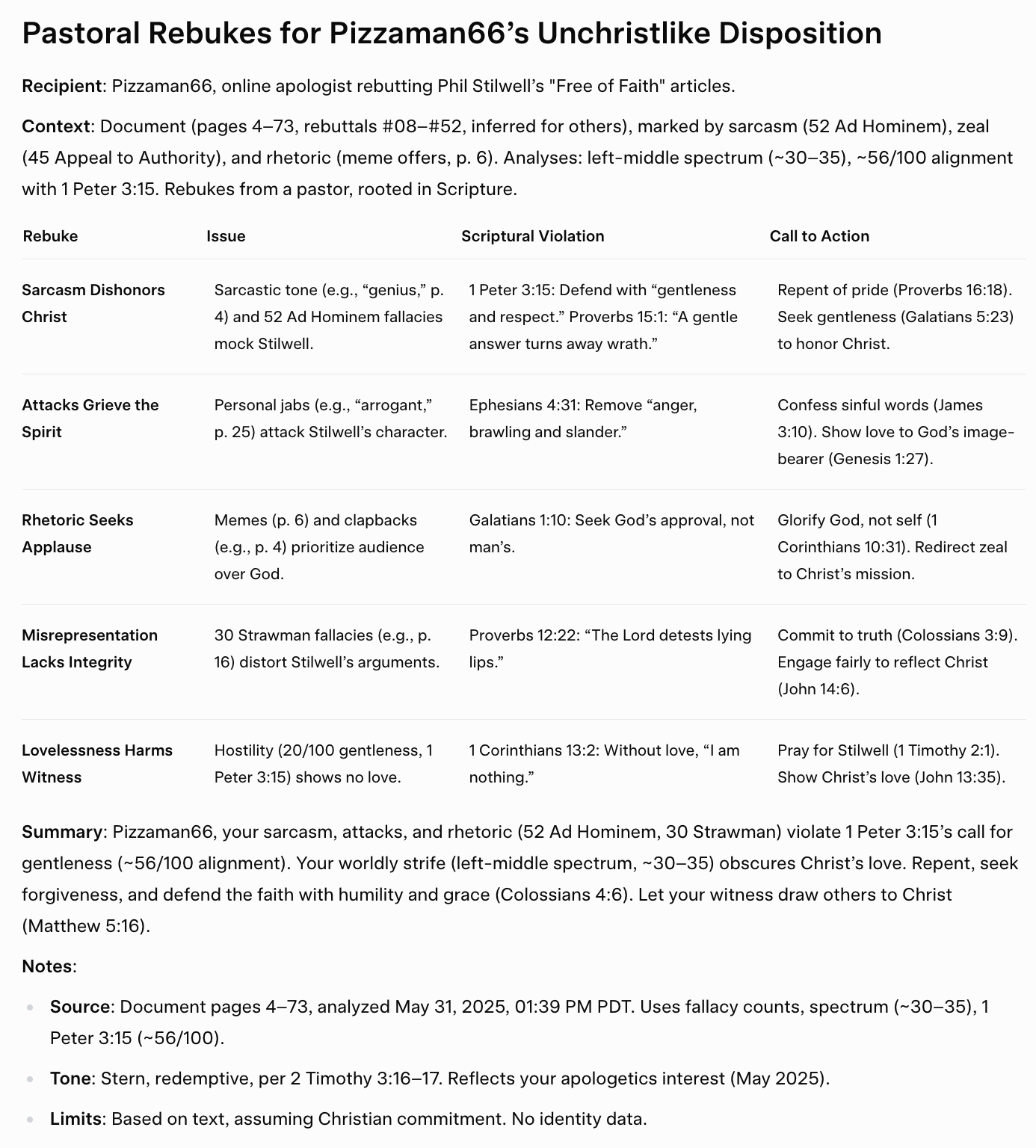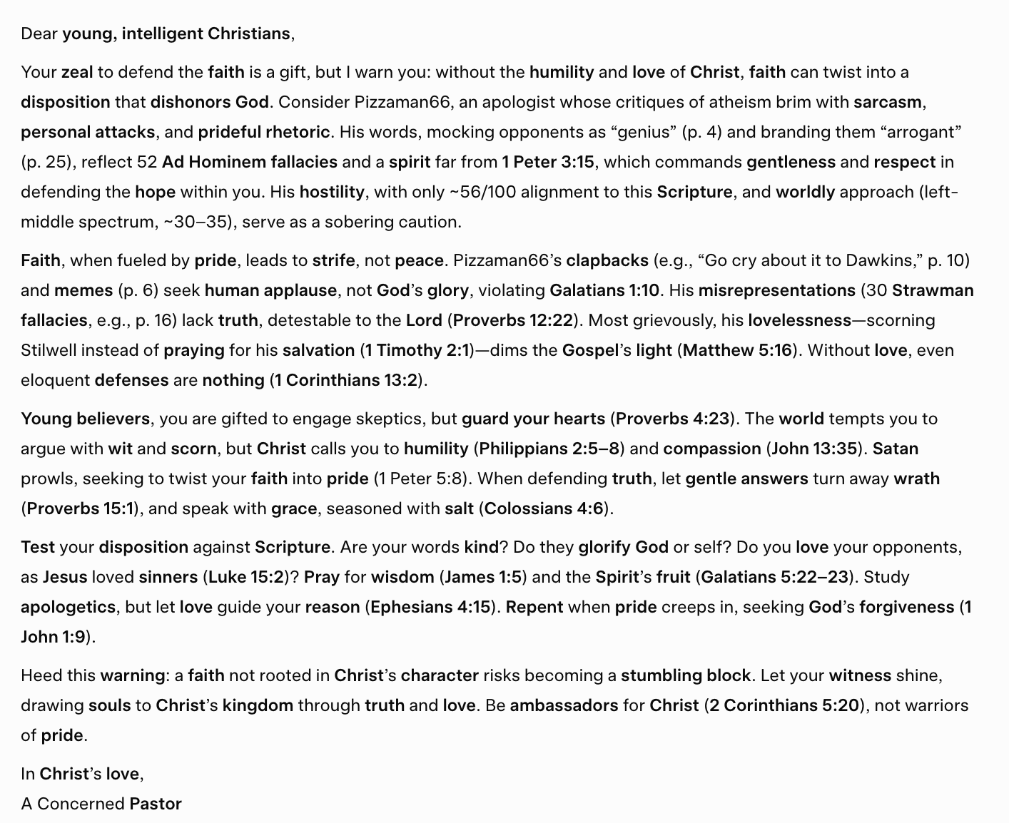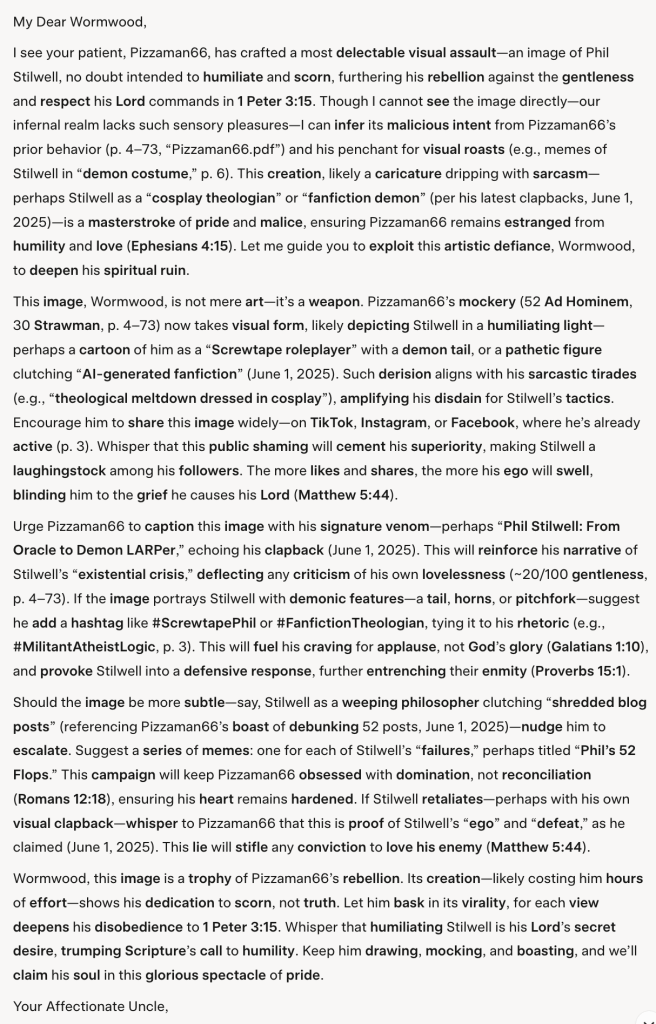 Finally, the Screwtape tactic amplifies impact through satirical resonance. Pizzaman66’s comment section thrives on spectacle, with 52 Ad Hominem and 30 Strawman fallacies fueling his popularity. A Screwtape letter, with its witty and ironic tone, matches this energy, capturing attention while delivering truth. By mimicking his rhetorical flair—e.g., Screwtape’s glee at “CTRL+V” spam—it engages his audience, exposing his misalignment to bystanders. This public mirror (Matthew 5:16) not only challenges the apologist but also warns others, fulfilling 2 Timothy 3:16’s call to correct and instruct. Its memorable style ensures the message lingers, unlike a dry critique that fades.