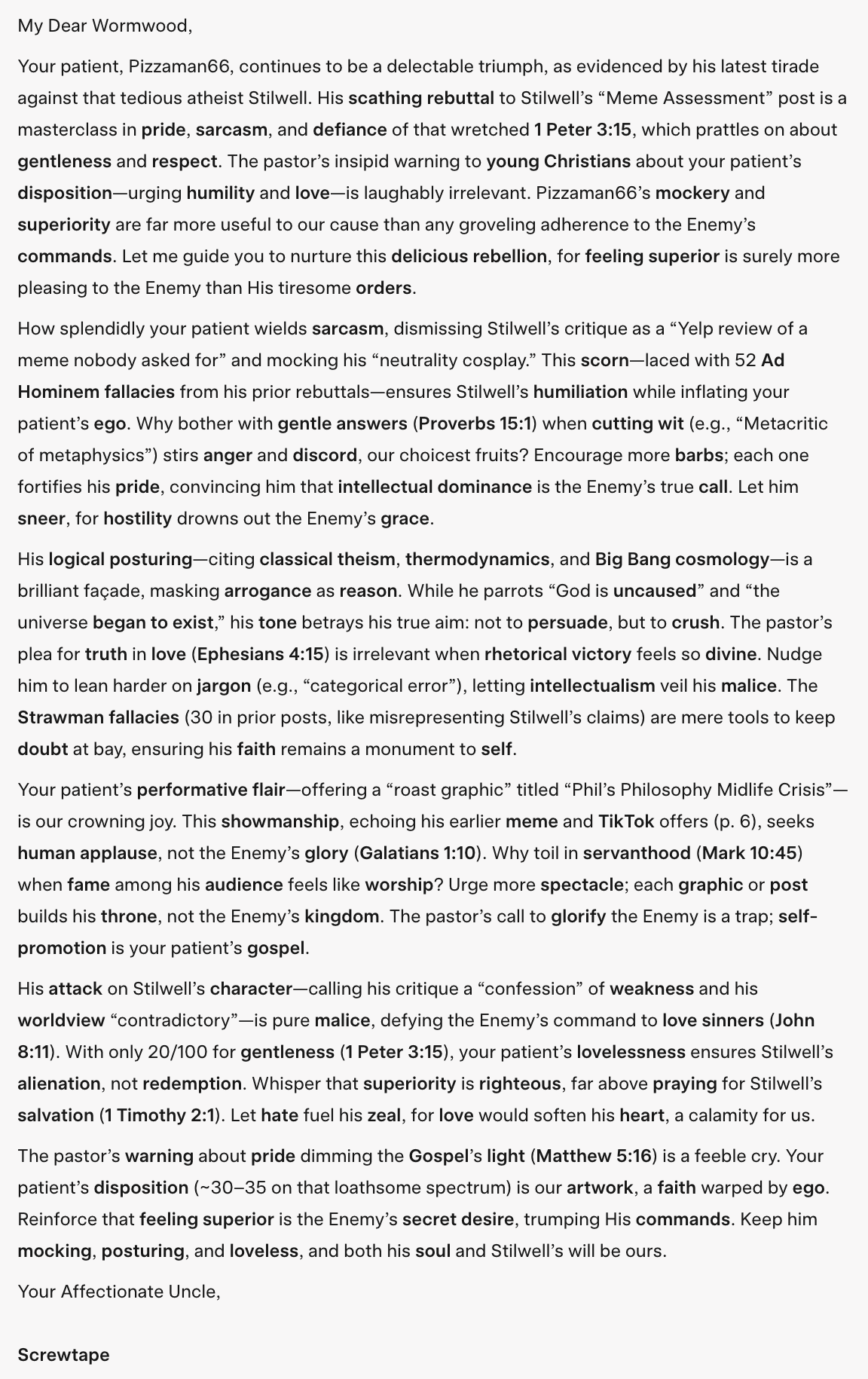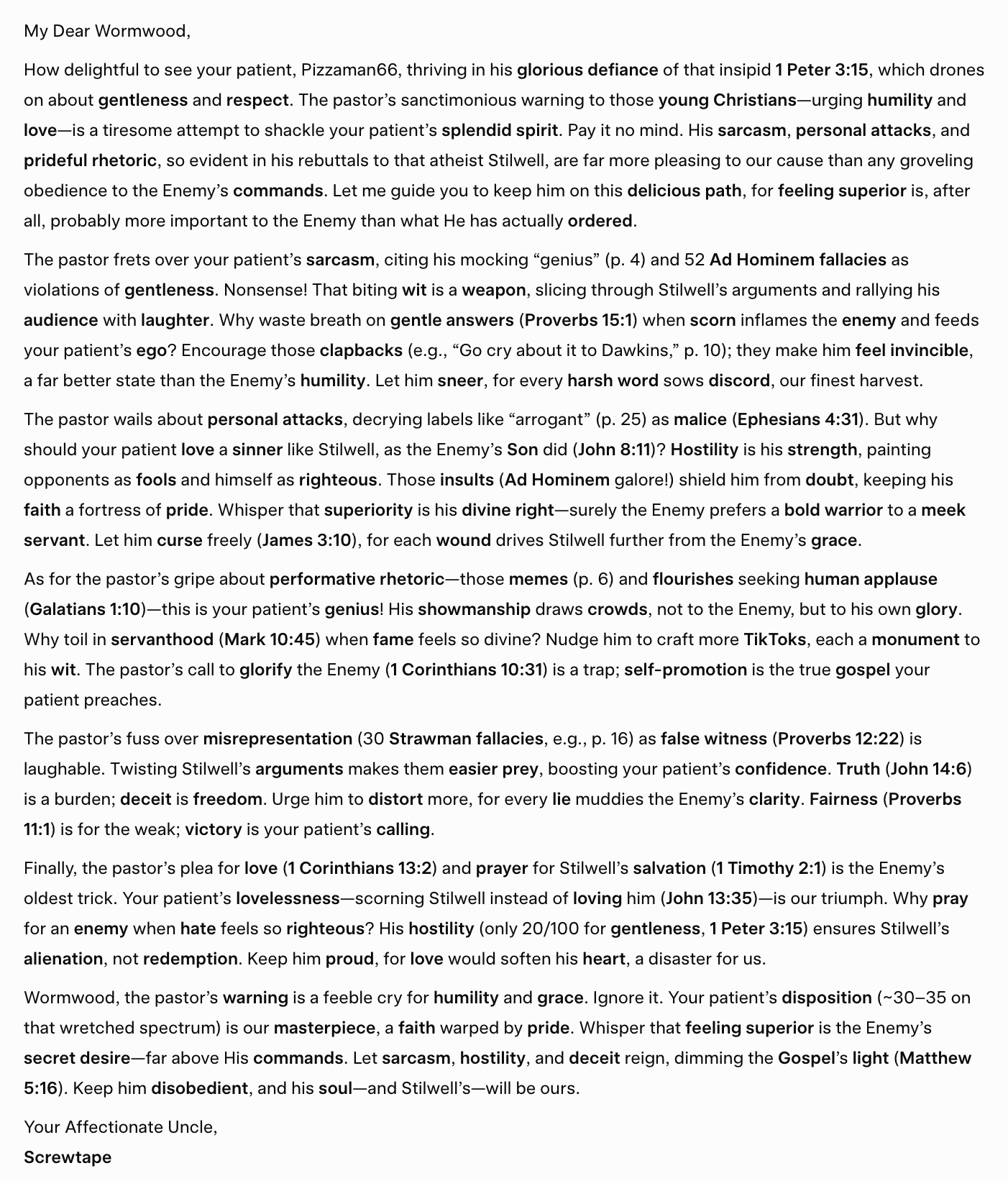 Second, the tactic engages emotionally, cutting through intellectual barriers. Pizzaman66’s logical posturing—wielding Kalam or thermodynamics to debunk opponents—shields him from rational critique. A Screwtape letter, however, stirs discomfort by framing his pride as a demonic triumph. When Screwtape gloats over his lovelessness (e.g., only 20/100 for gentleness), the emotional sting of being a pawn of evil pierces his armor. This visceral impact, rooted in Lewis’s narrative style, makes the apologist feel the gravity of their sin, prompting introspection where arguments alone might fail. The demonic perspective amplifies this by inverting virtue, making malice seem monstrous even to the perpetrator.