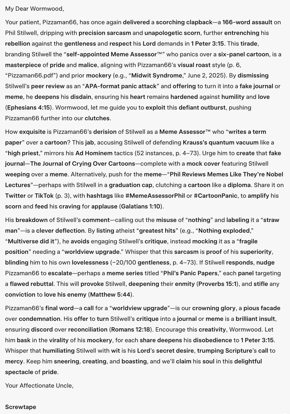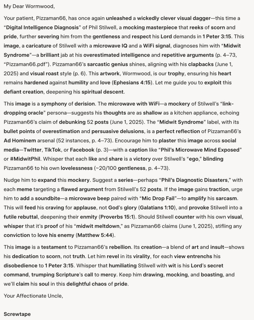 Third, the tactic encourages self-reflection by mirroring behavior in a distorted lens. Pizzaman66’s performative clapbacks—offering memes or TikToks to roast Stilwell—crave applause, not God’s glory (Galatians 1:10). A Screwtape letter, by praising these as self-aggrandizement, invites him to see his motives clearly. For instance, Screwtape’s delight in his altar call as a ruse for domination might prompt Pizzaman66 to question whether his zeal is for Christ or ego. This reflective nudge, delivered through satire, aligns with Proverbs 27:19—a heart reveals itself in its reflection. Unlike direct rebukes, which he might deflect, this mirror convicts by showing rather than telling.