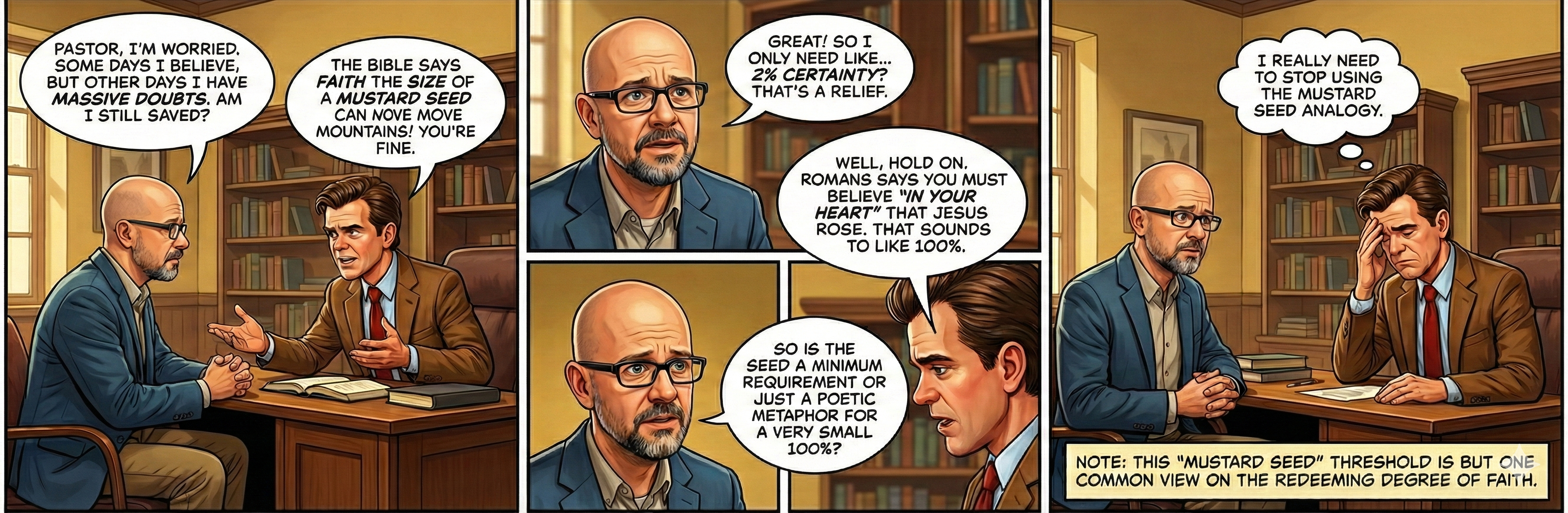 Biblical texts such as Matthew 17:20 suggest that faith “the size of a mustard seed” is sufficient for redemption. If true, this sets a low threshold, potentially redeeming even those with significant doubts.