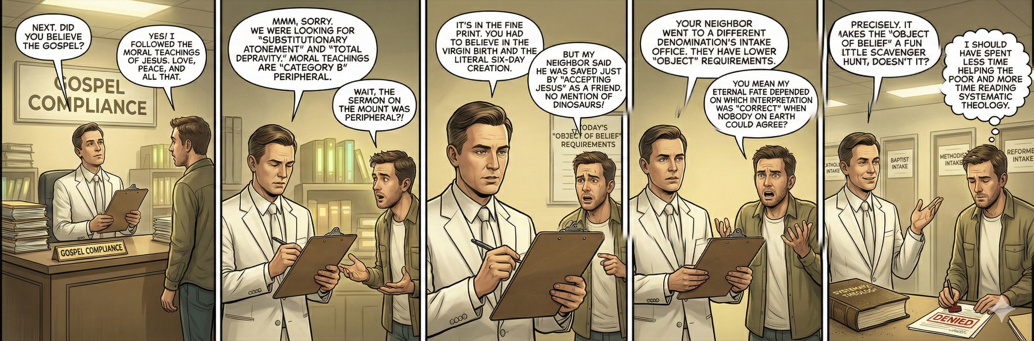 Christian denominations differ widely in their understanding of essential doctrines. A Catholic may emphasize the authority of the Church and sacraments, while a Protestant focuses on sola fide (faith alone). If final judgment hinges on the correctness of one’s beliefs, how can individuals be fairly judged when the object of belief is not universally agreed upon?
