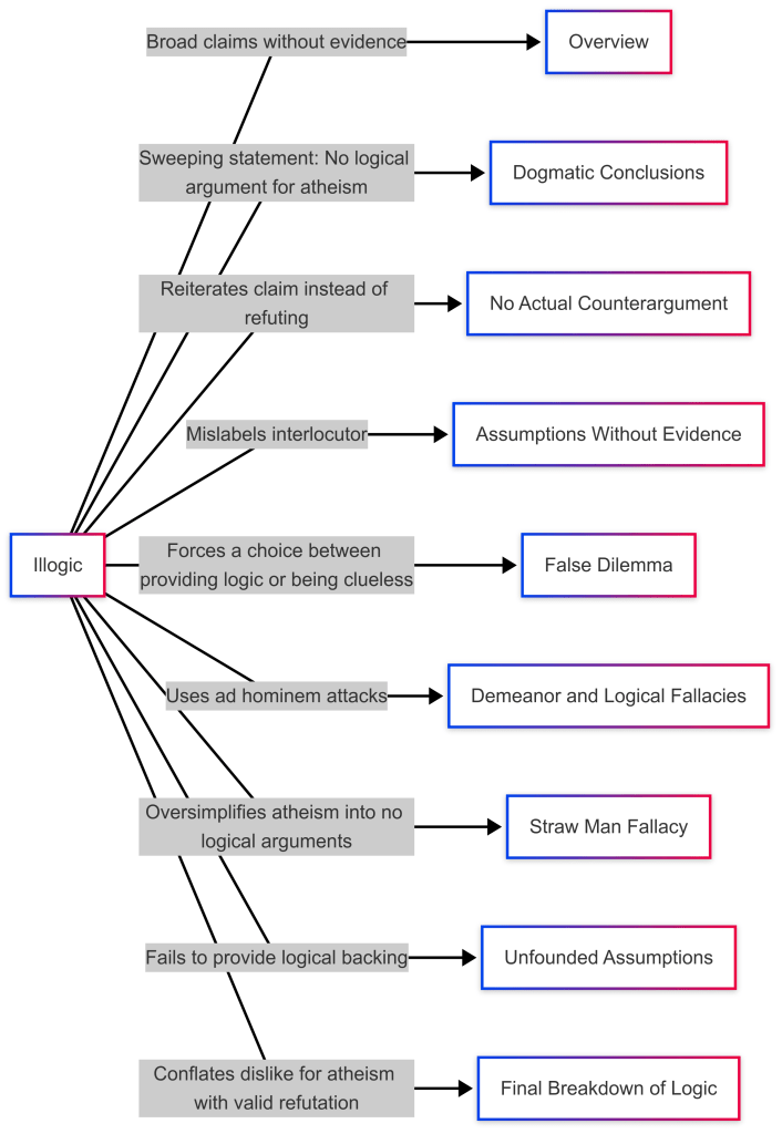 Riaan presents himself as someone very confident in logic and philosophical discourse, yet his comments manifest several fallacies that undermine the rational force of his arguments. He begins by declaring atheism devoid of logical arguments and, despite repeated challenges to substantiate his claim, never provides a systematic analysis or well-formed logical structure to justify it. Instead, he attempts to shift the burden of proof, demands instant rebuttals, and resorts to ad hominem.