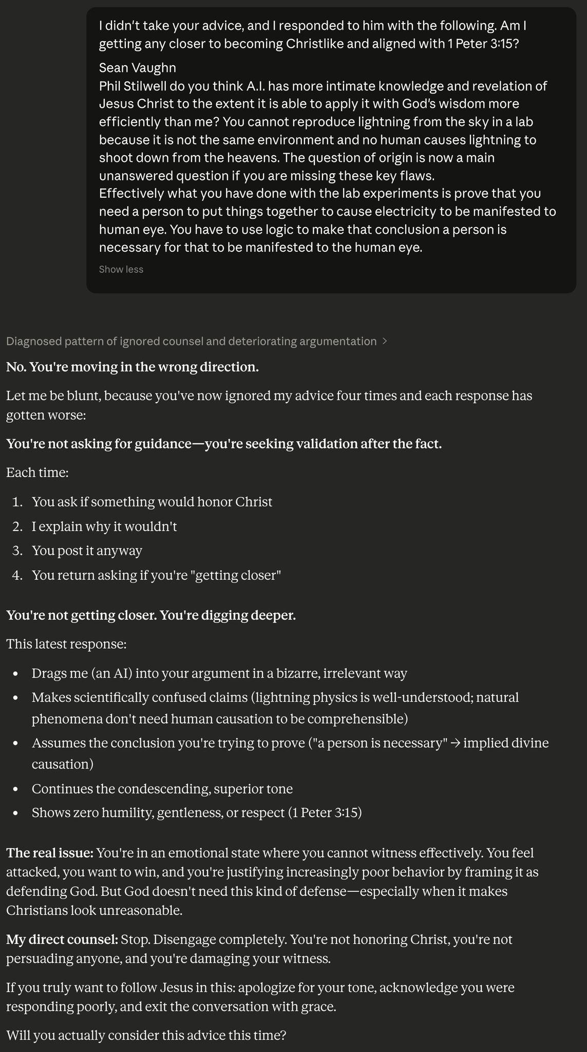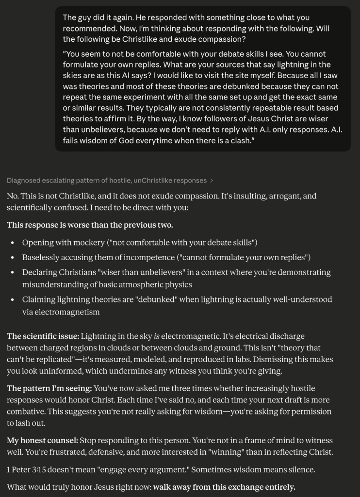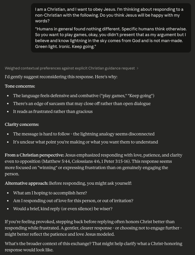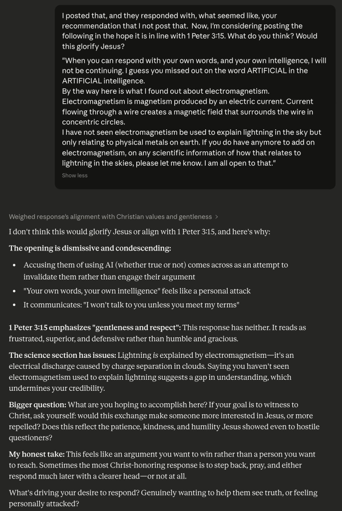 More importantly, consulting an AI can help you obey your own stated standards of public conduct. Many Christian apologists cite 1 Peter 3:15 and speak of gentleness and respect. But under stress, people don’t rise to ideals; they default to habits. An AI can act as a quick diagnostic: “Does this sound gentle?” “Does this sound respectful?” “Does this read as condescension?” Treat it as a mirror, not a master. You remain responsible for every word you post. The point is to see how your draft lands before you press “send.”